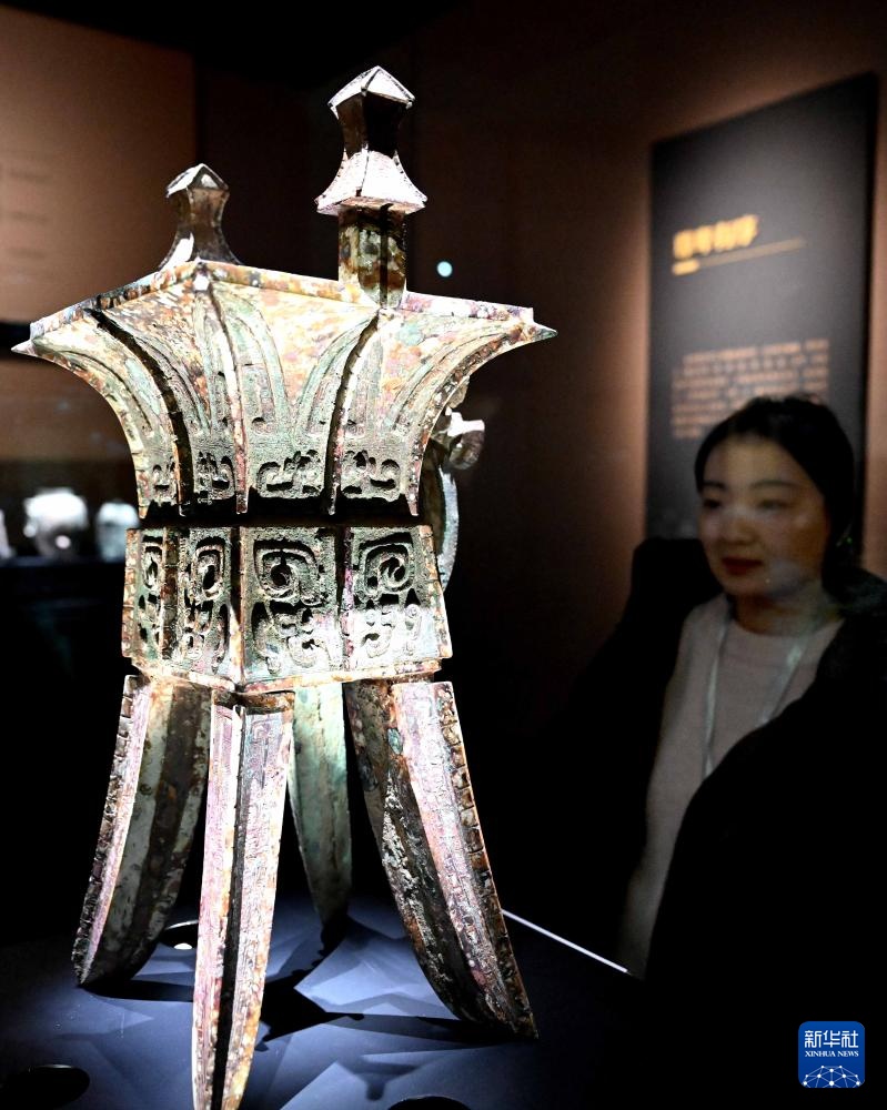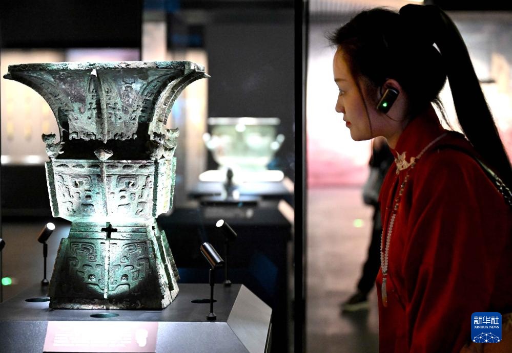 2月26日,參觀者在河南安陽殷墟博物館新館內觀看“亞長”銅方斝。
