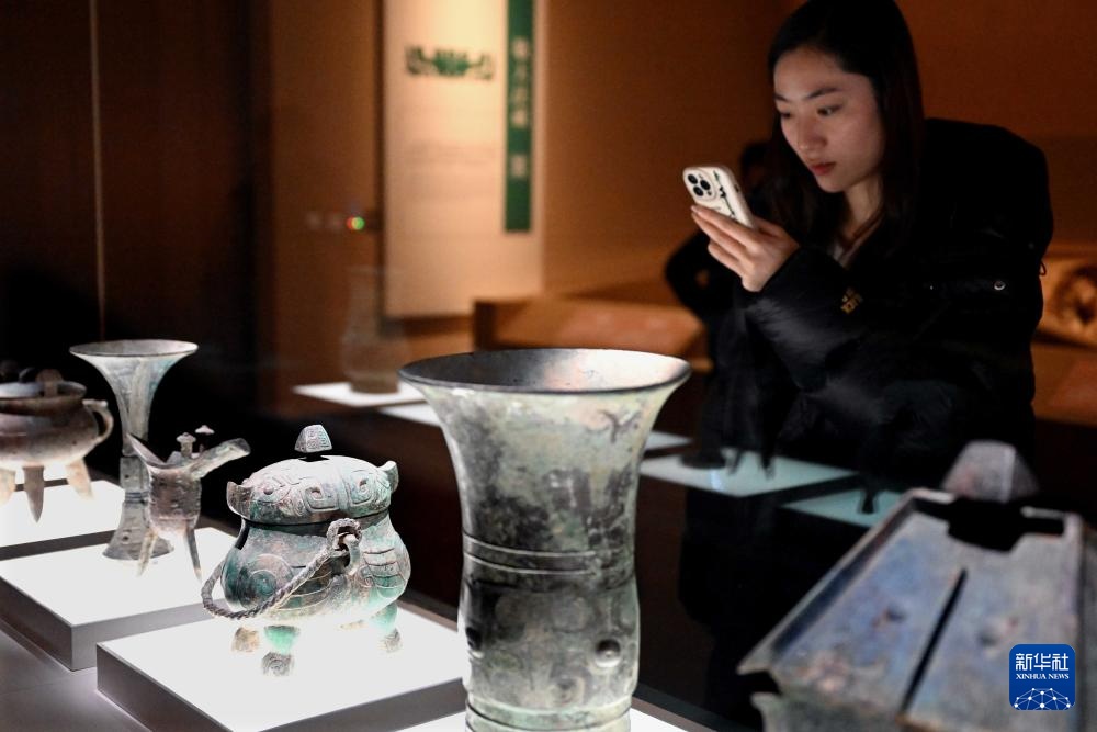 2月26日,參觀者在河南安陽殷墟博物館新館內拍攝展品。