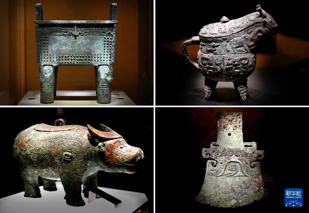 這是河南安陽殷墟博物館新館內展出的“司母辛”銅鼎(左上)、“亞長”銅觥(右上)、“亞長”牛尊(左下)、“亞長”銅鉞(拼版照片,2月23日攝)。
