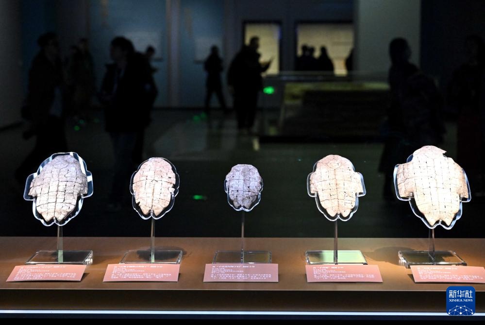 2月26日,參觀者在河南安陽殷墟博物館新館內觀看展出的刻辭卜甲。