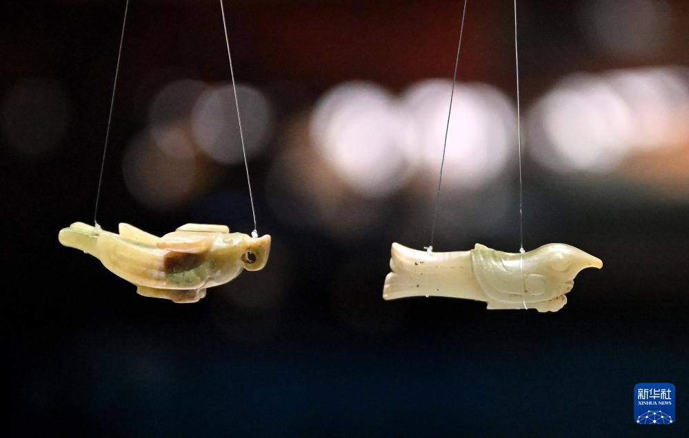 河南安陽殷墟博物館新館內展出的玉鳥(2月26日攝)。