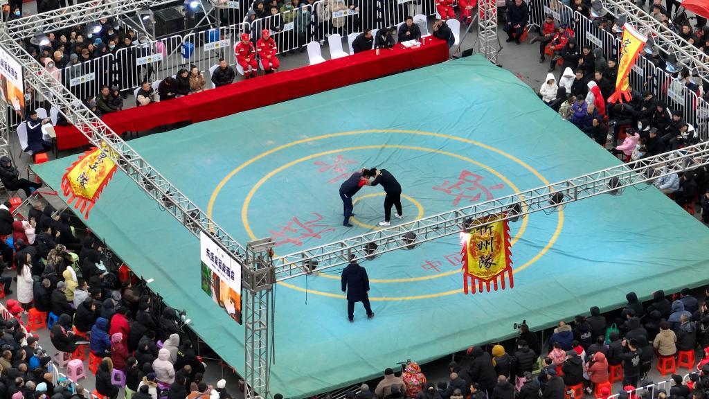 “抱腿!使勁兒!倒了倒了!”農歷正月初十下午,山西省忻州市忻州古城廣場上人山人海,一場激烈的撓羊賽正在上演。賽場上,兩名選手斗技角力,爭得面紅耳赤。賽場下,觀眾扯著嗓子加油、叫好,喊得也是滿臉通紅。
