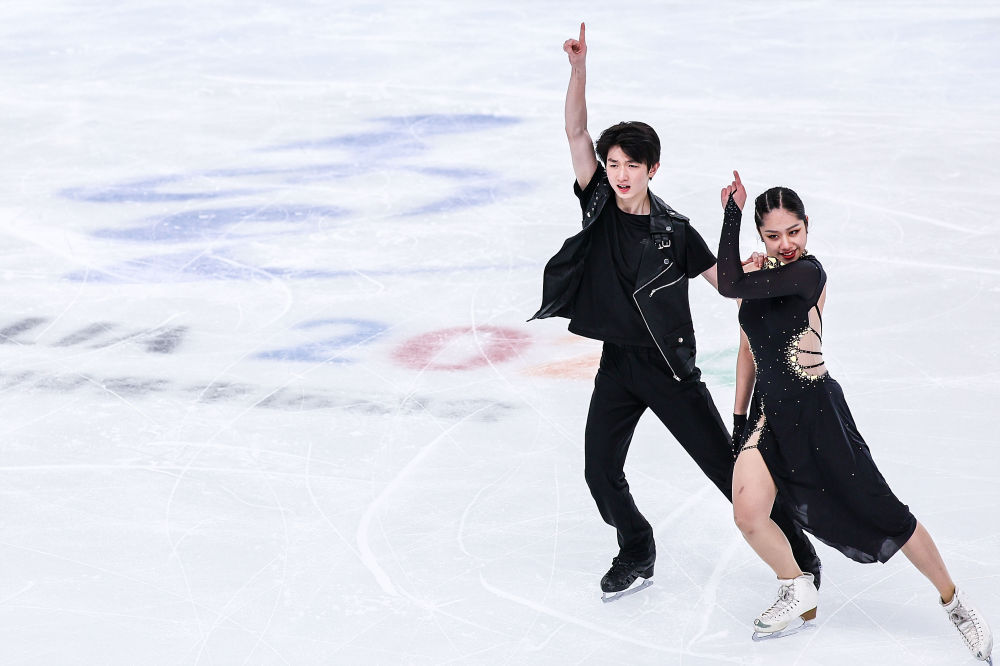 2月24日,香港隊(duì)組合康然(右)/鄒函運(yùn)在十四冬花樣滑冰(公開組)冰上舞蹈韻律舞比賽中。