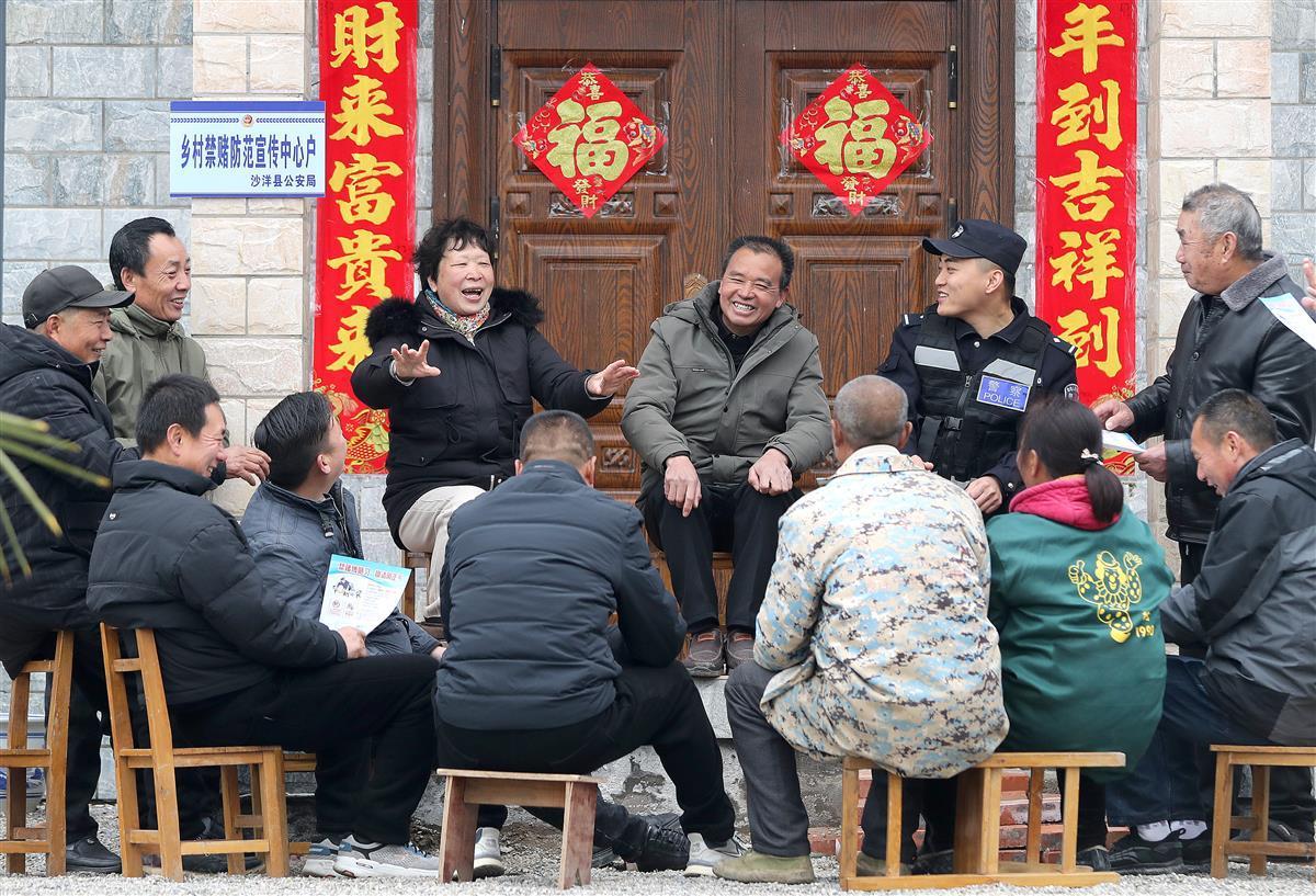 2月28日,在湖北省沙洋縣馬良鎮耀星村,“鄉村禁賭防范宣傳中心戶”王友軍夫婦正在向鄰居們宣傳賭博危害。
