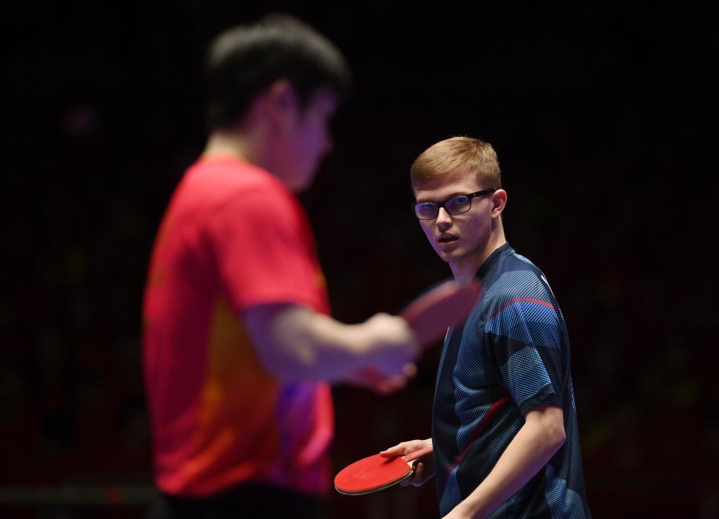2月25日,法國(guó)隊(duì)選手艾利克斯·勒布倫(右)與中國(guó)隊(duì)選手樊振東在比賽中。新華社記者 陶希夷 攝