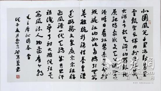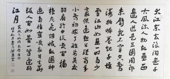 清代書畫家沈宗騫在《芥舟學畫編·用筆》中談到:昔人謂筆力能扛鼎,言氣之沉著也。凡下筆當以氣為主,氣到便是力到。應該說筆力是產生氣勢的物質基礎。谷有荃章草充沛的筆力是建立在深厚的功力和圓熟的用筆基礎之上的。他的六尺整張作品《蘇東坡念奴嬌 赤壁懷古》和《毛澤東詩詞沁園春·雪》這兩幅畫作品筆中發力多,線條穩定流暢,大部分字以肥為主,且肥而有骨,肉豐而力沉,點畫運行之間,流暢遒勁。許多鑒賞家評價:谷有荃先生的章草肥不露肉,寬不掩秀,筆力充沛,韻味無窮。還有一些書家贊曰:谷先生章草筆中有物,物中有力,沉著平靜,蒼勁凝練,傾之則泉注,頓之則山安。
