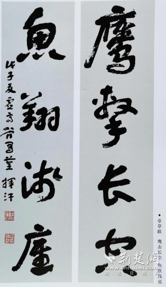 谷有荃章草的節奏之美流露于紙素之上,飄逸著一種動感之美。他的章草聯“鷹擊長空,魚翔淺底”這幅作品,用筆的節奏明快,墨色鮮活。具體來說,就是通過“輕、重、緩、疾”和由此派生出來的若干筆法,形成富有樂感的節奏,讓挺拔的線條組成陽剛之美,讓柔和的線條組成陰柔之美,讓枯澀的線條組成老辣之美,讓溫潤的線條組成凝煉之美。整幅作品的生動,來源于每個字:“空”,靜如虎臥平崗;“翔”,動如飛鳥游天;“鷹”,如飛瀑瀉崖;“擊”如亂石穿云。優美的節奏,雖然有快慢、輕重之分,但能看出書者的匠心,他在追求一種動態之美的平衡,讓心靈之煙華入紙,讓風采之雙翼振飛。初唐虞世南談到韻律時曾感慨:“迅速虛實,若輪扁斫輪,不疾不徐,得之于心,而應之于手,口所不能言也”。(《筆髓論》)