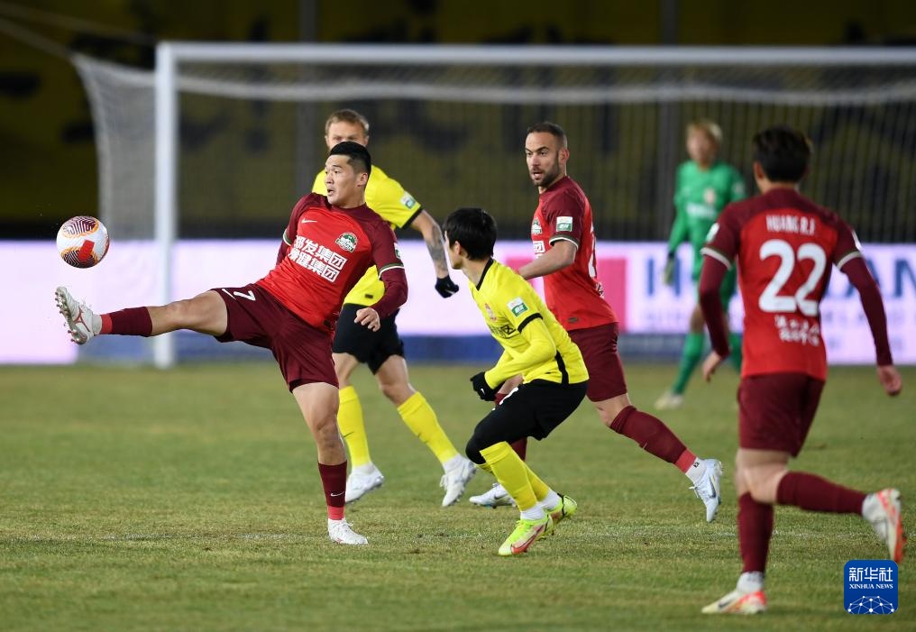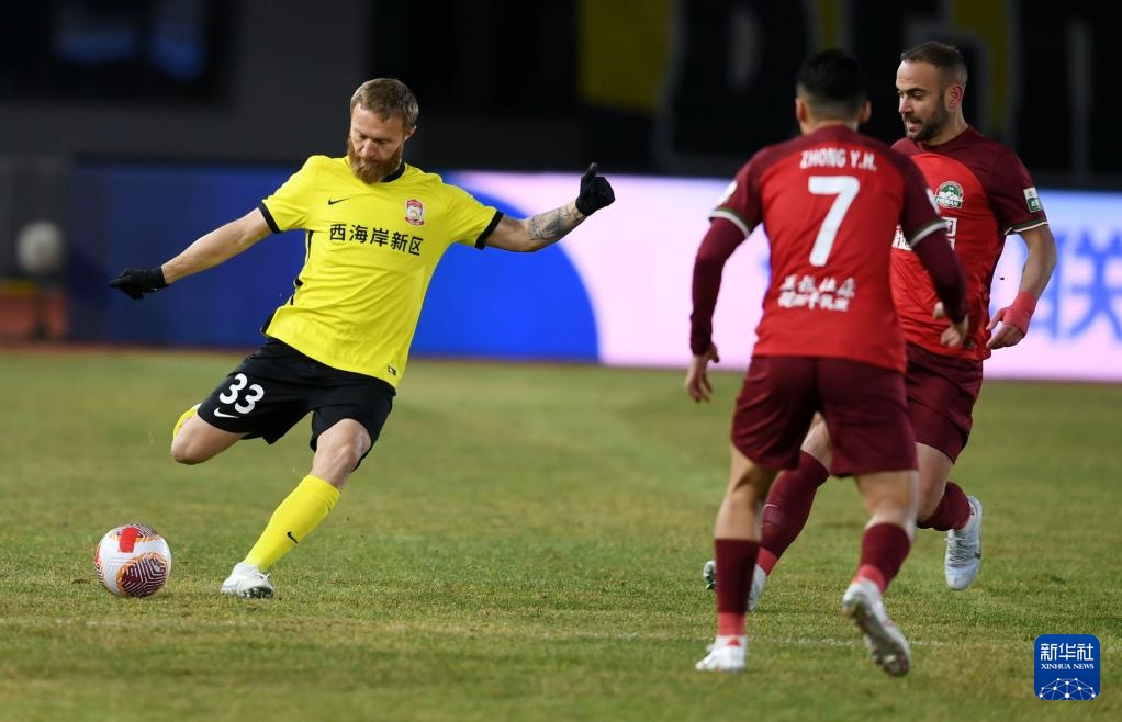3月1日,青島西海岸隊球員哈羅揚(左一)在比賽中傳球。