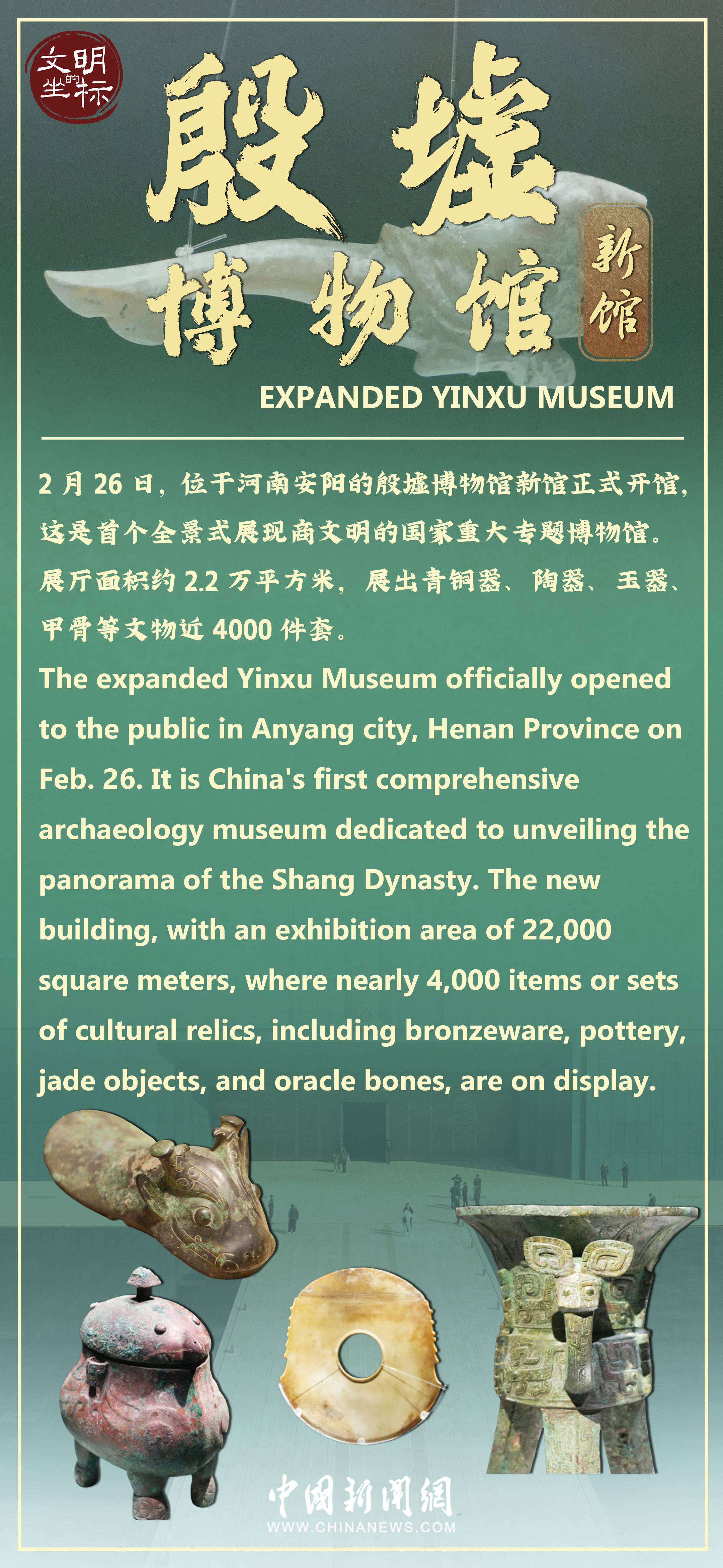 河南安陽,洹水之濱。一座青銅色的博物館大氣莊重,與殷墟宮殿宗廟遺址隔河相望,這就是殷墟博物館新館。2月26日,這里正式面對公眾開放,館內(nèi)展出青銅器、陶器、玉器、甲骨等文物近4000件套,四分之三以上的珍貴文物屬首次亮相,包括我國博物館現(xiàn)存的唯一一件文字鑲嵌綠松石的甲骨。位于展館一層的殷墟車馬遺跡展,用矩陣式展陳方式,展出殷墟出土的23輛馬車,再現(xiàn)3000多年前的歷史景象。走進(jìn)殷墟博物館新館,感受當(dāng)年車轔轔、馬蕭蕭的恢宏場景。