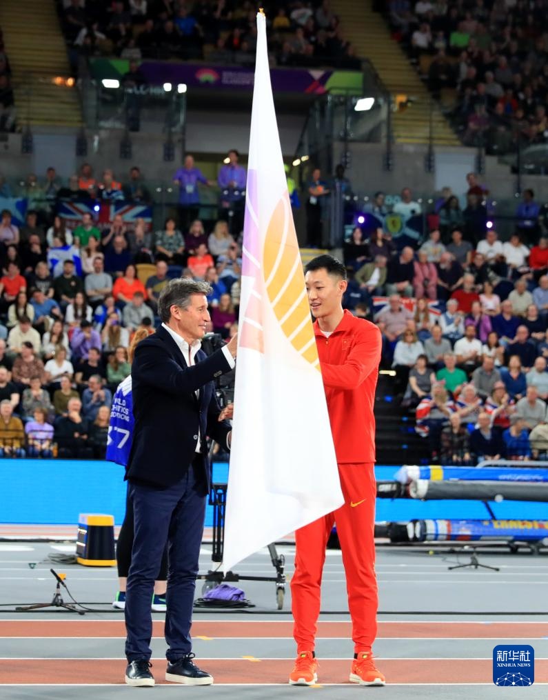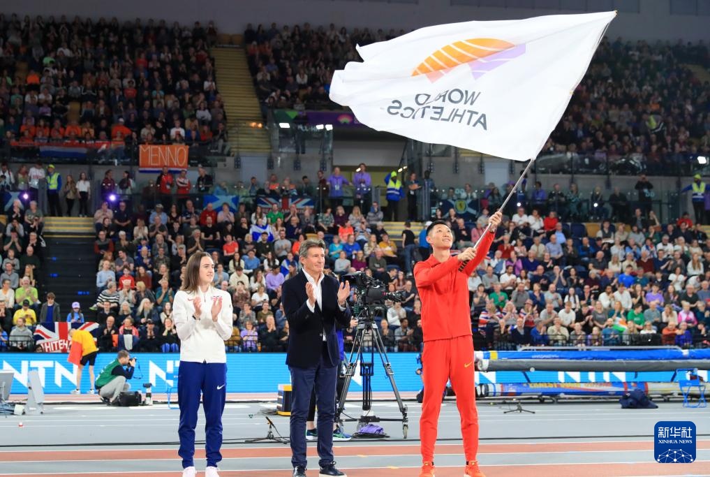 3月3日,中國田徑運動員王嘉男(右)在會旗交接儀式上揮舞世界田聯旗幟。2025年室內田徑世錦賽將在中國南京舉行。新華社記者 李穎 攝