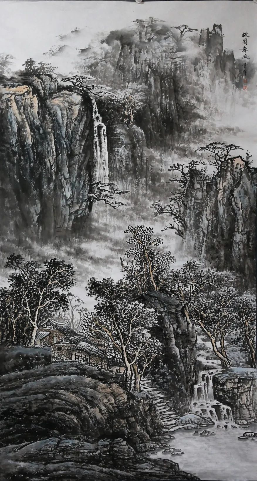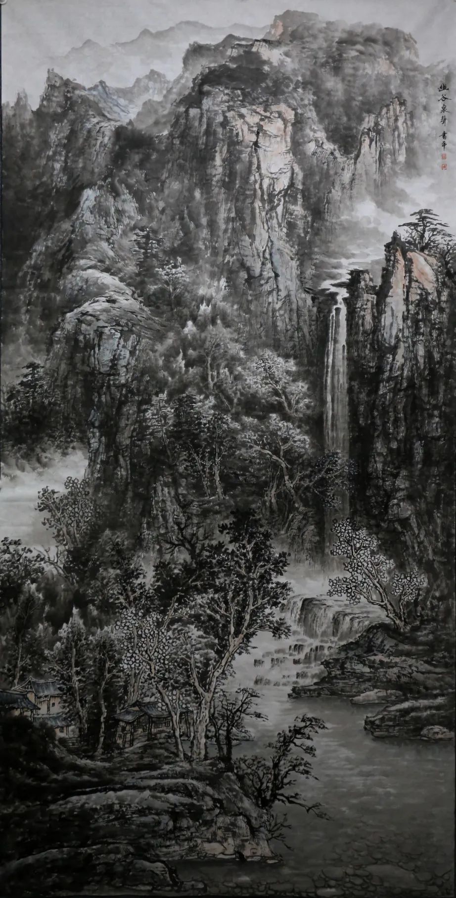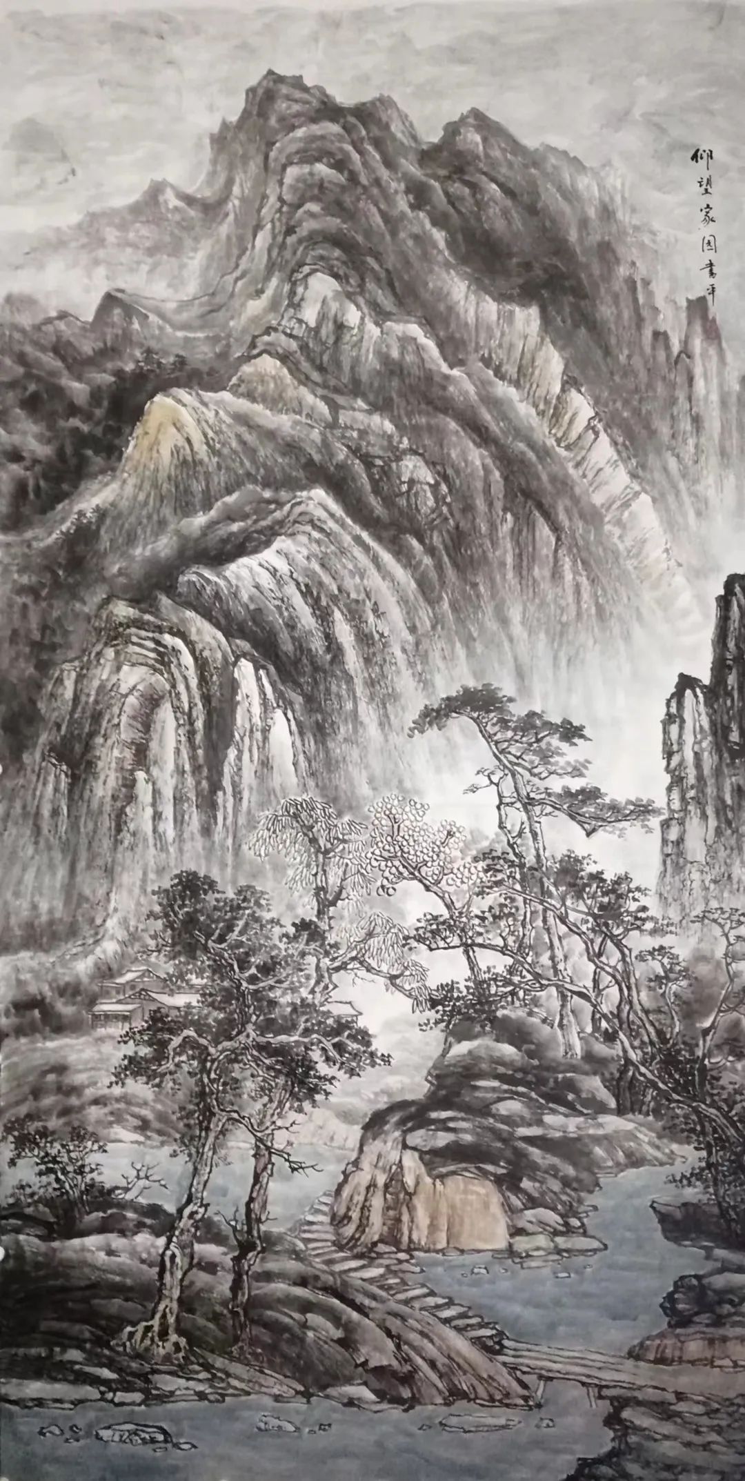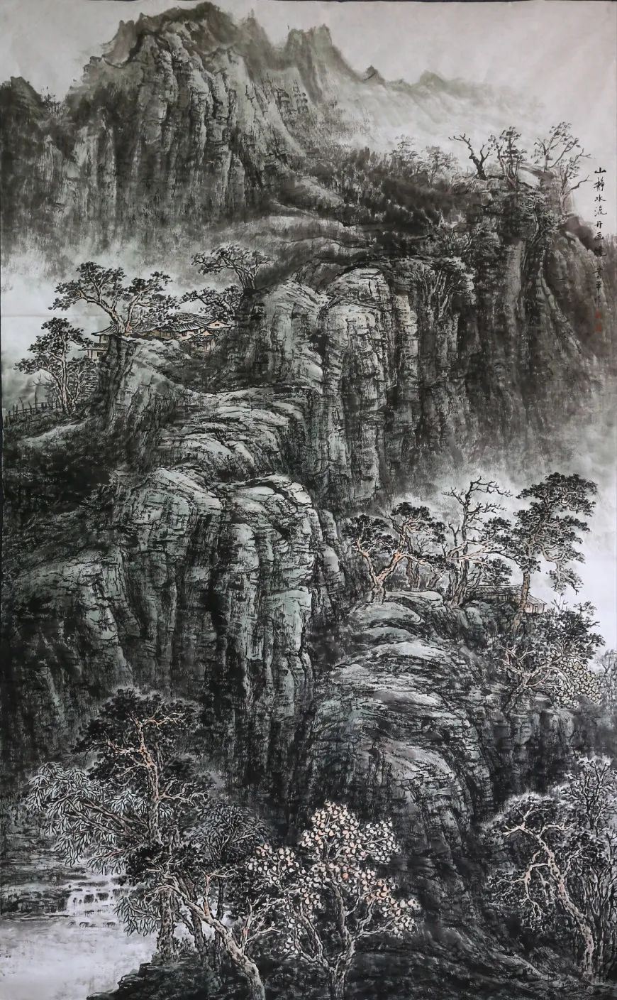 賞讀劉書平的畫作,讓我驚訝,對他這種風格的畫已經久違了,所以站在他的畫前,總有滿懷的激動。一個畫家潑墨揮毫,丹青寄懷,但大多走的還是文人畫的路子,在寄托情懷上去呈現自己的藝術領悟。不過,劉書平卻不是如此的。他的畫作,即使放進很多名家的行列,也照樣閃爍著特有的色彩,無論運筆與用墨,乃至構圖,都無甚可挑剔的,這得益于他的文學修養和審美意趣。在我看來,他畫的是較難的一種山水畫,不僅要求技法嫻熟,也要求有一種闊遠而浩大的胸襟,統籌調度,縱橫捭闔,這不是那么容易可以做到的,不經意間就會有所紕漏,或見石不見山,或顧此而失彼,于張皇里露出諸多的不足來。不過,這都與劉書平并不相干。