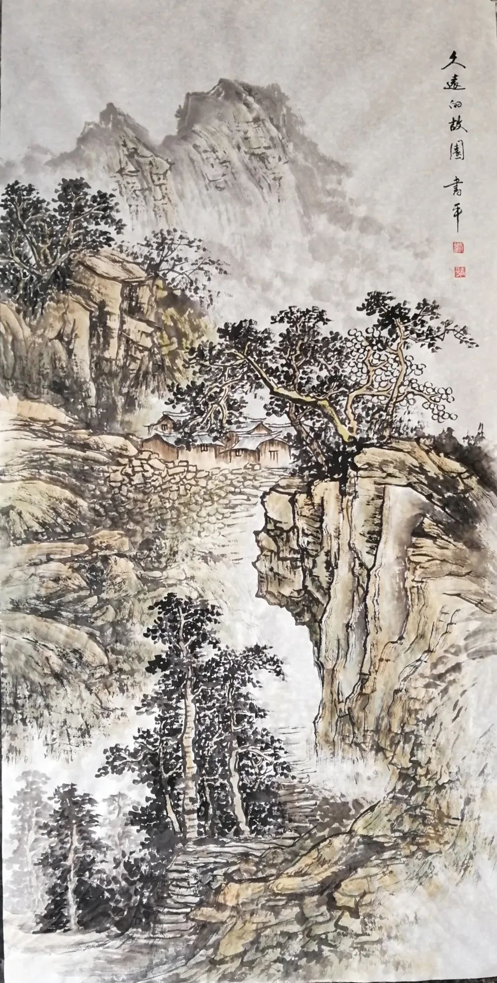 賞讀劉書平的畫作,不僅可見其藝術,還可以讀到故事。其發表在北京刊物上的兩幅作品《楚江煙云》《秋水圖》,不但有風景也有情致,更有悠長的故事,可供細細品讀。那悠遠的意境,峭峻的雄奇,呈現了山川鮮明的地域性,巫山云楚峽雨,造就了神奇而渺遠的背景。但我更感興趣的還是,老松樹下的那幾間屋,仿佛有歡聲笑語,有酸甜苦辣;還有那長長的一直延伸入江的石級,江水之上的一葉扁舟,這都是人情。仿佛有了這濃郁的人情,畫面的這山山水水就不空寂,就充滿著盎然的情趣。