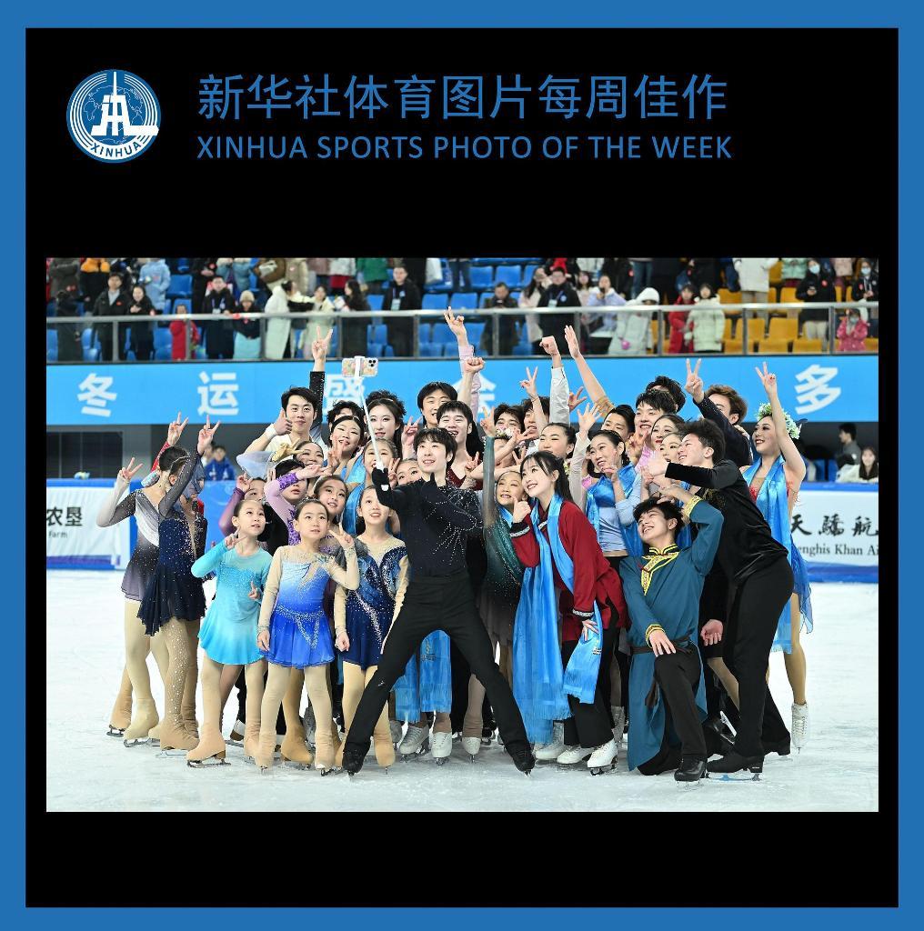 2月27日,表演滑結(jié)束后,花滑運(yùn)動(dòng)員們?cè)谫悎?chǎng)合影。