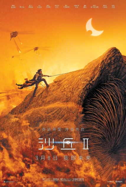 《沙丘2》由“科幻電影新教父”丹尼斯·維倫紐瓦(《沙丘》《降臨》《銀翼殺手2049》)執導,提莫西·查拉梅、贊達亞、麗貝卡·弗格森、哈維爾·巴登、喬什·布洛林、斯特蘭·斯卡斯加德、戴夫·巴蒂斯塔、夏洛特·蘭普林、奧斯汀·巴特勒、克里斯托弗·沃肯等主演,將于3月8日在內地上映。