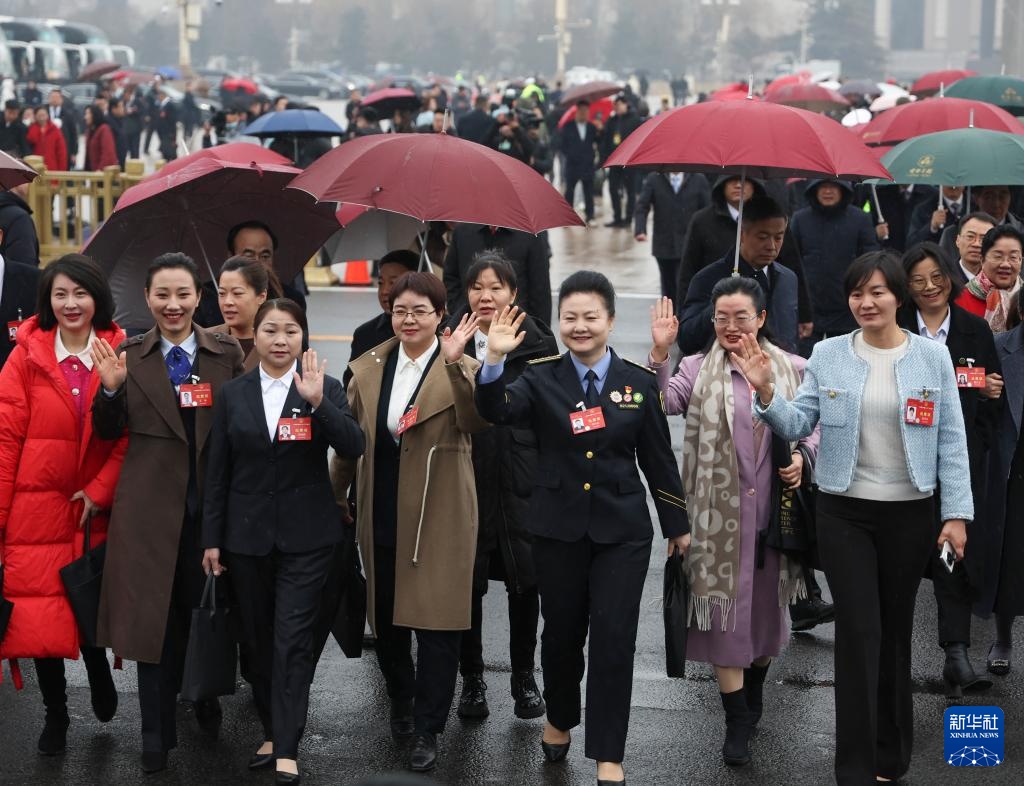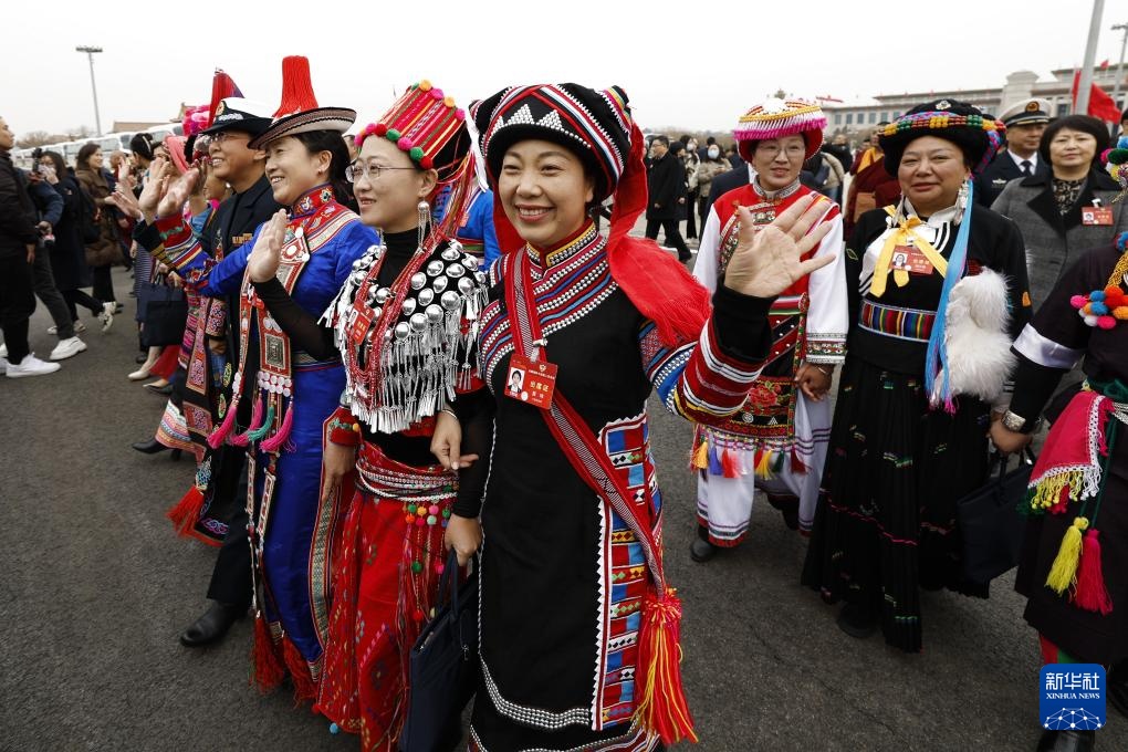 3月4日,身著民族服飾的政協委員們走向人民大會堂,準備參加全國政協十四屆二次會議開幕會。