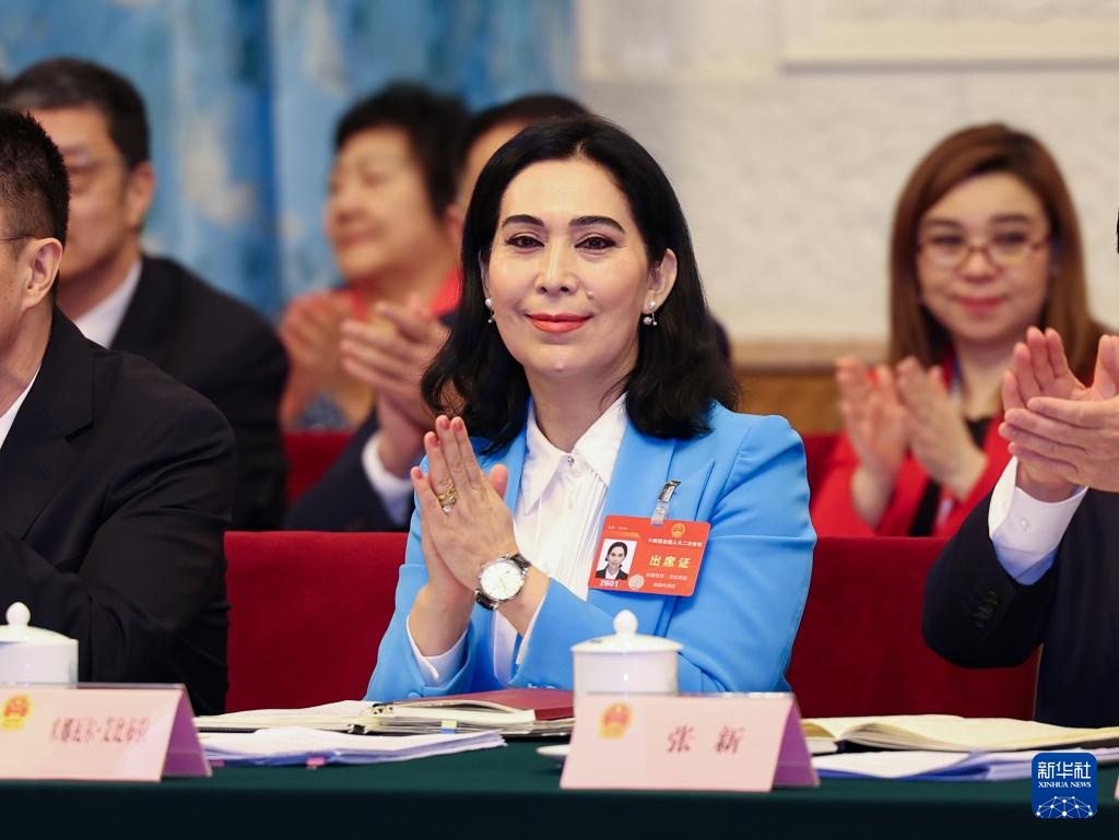 3月7日,米娜瓦爾·艾比布拉代表在十四屆全國人大二次會議新疆代表團全體會議上。