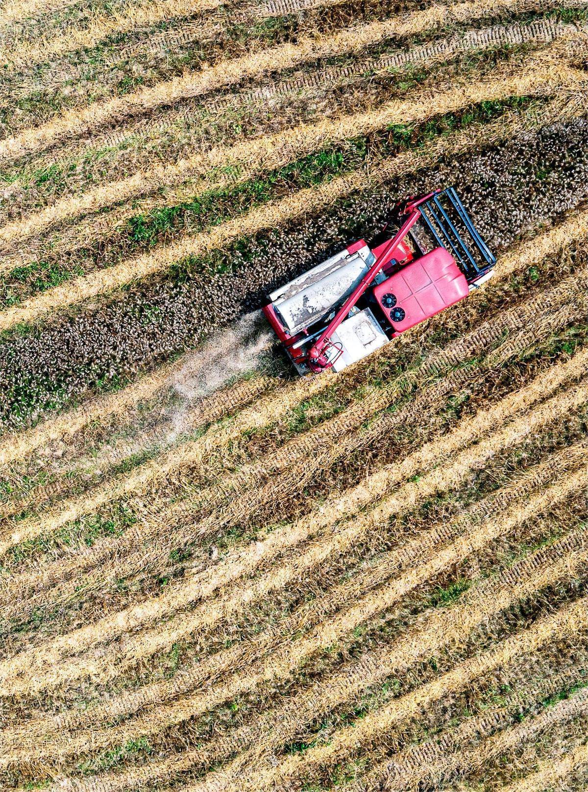 5月25日,武漢市新洲區紫薇高標生態農業示范基地,聯合收割機在麥田里“描繪”出豐收的“曲線”。(視界網 蒙曉東 攝)