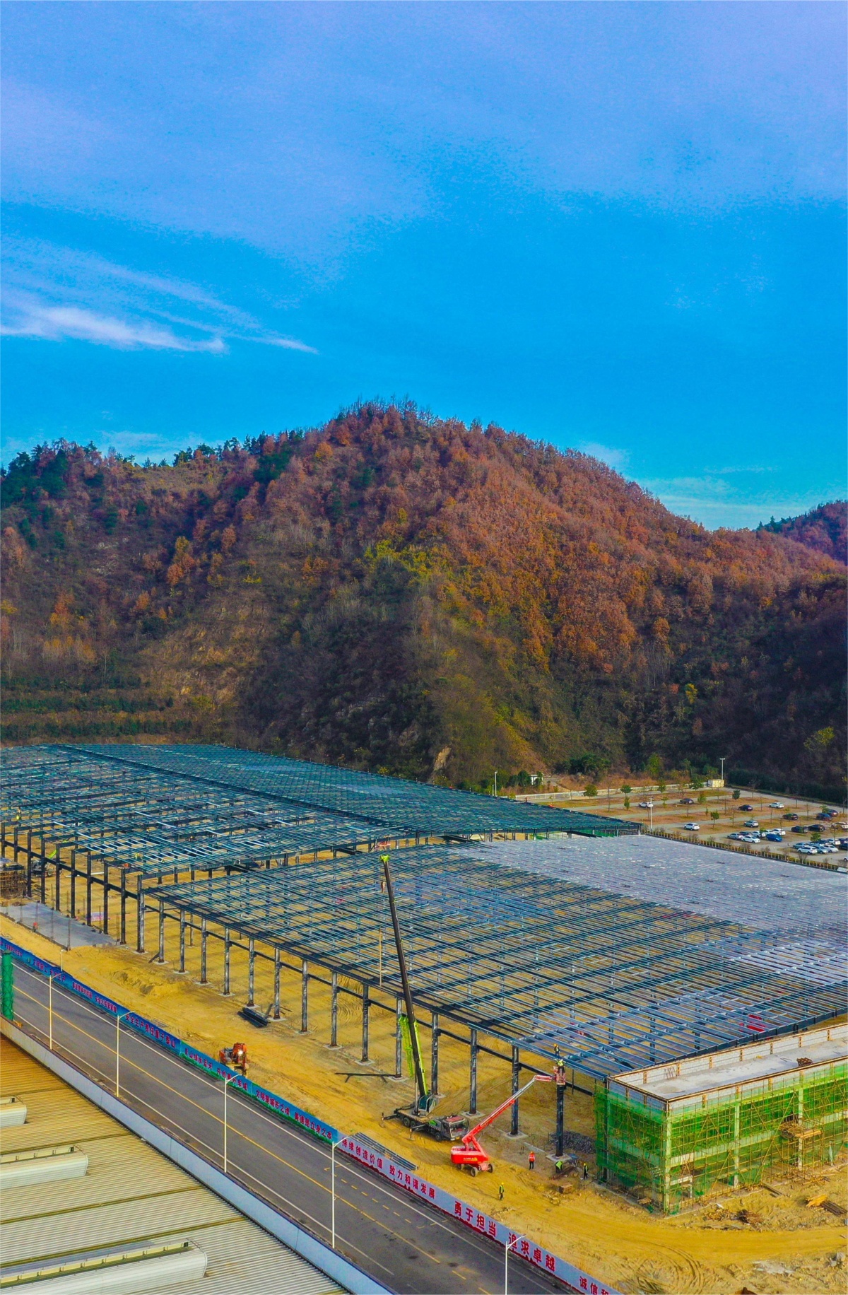 12月8日,東風商用車輪智能化新工廠項目(十堰張灣)在進行屋面施工。(湖北日報全媒記者田悅 通訊員葉航 攝)