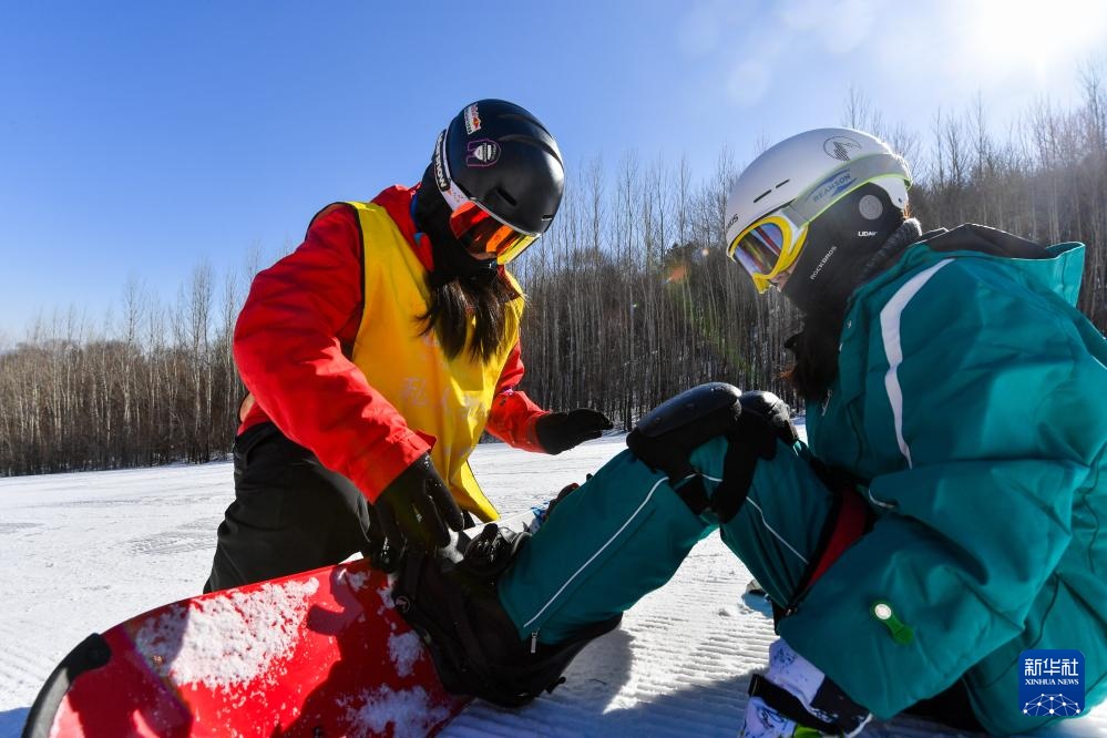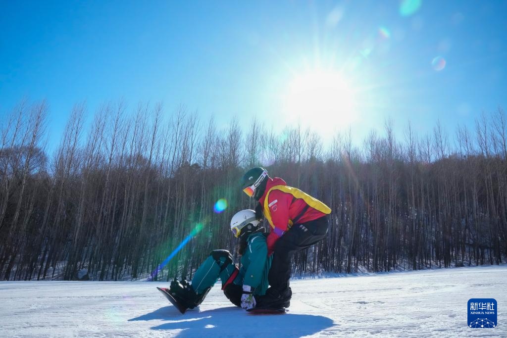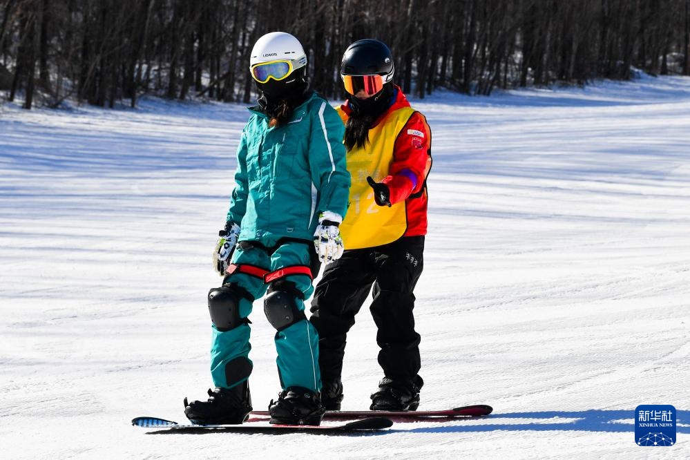 3月6日,王芳(右)在指導(dǎo)來自江蘇常州的游客學(xué)習(xí)單板滑雪。新華社記者 陳益宸 攝