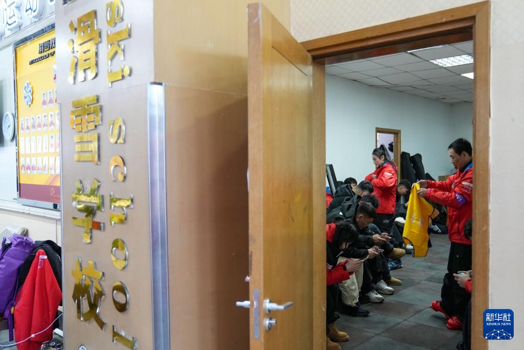 3月6日,從雪場回到休息室的王芳(左)與同為滑雪教練的丈夫交流。新華社記者 王建威 攝