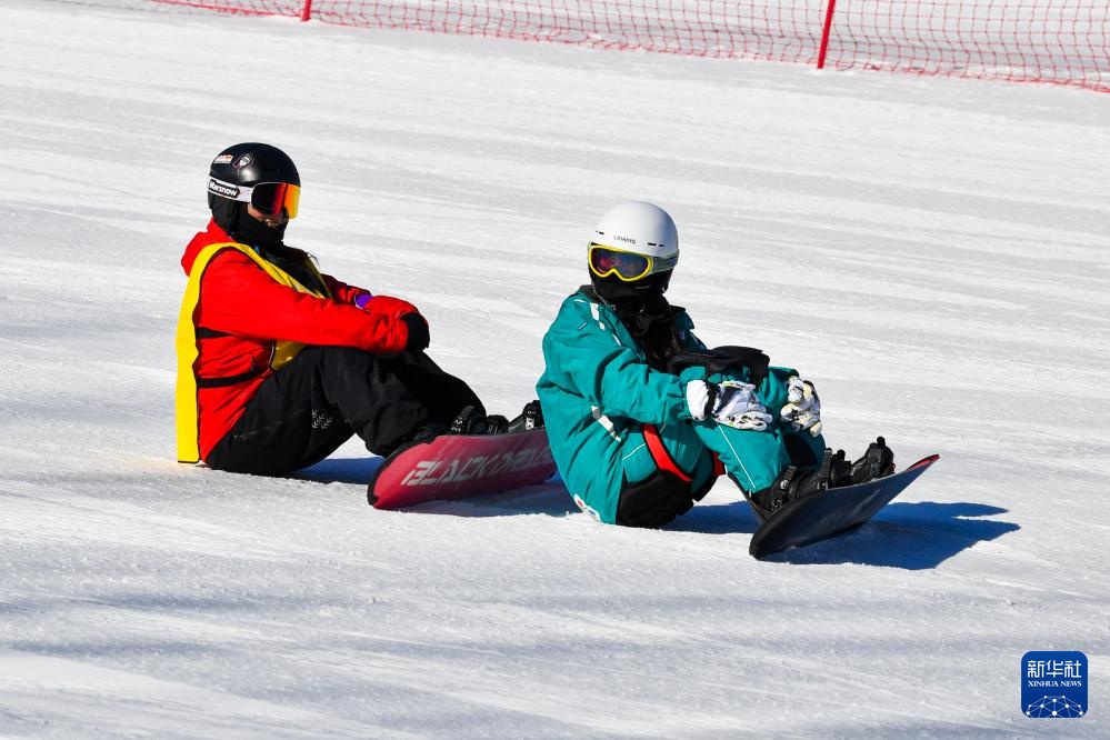 3月6日,王芳(左)在指導(dǎo)來自江蘇常州的游客學(xué)習(xí)單板滑雪。新華社記者 陳益宸 攝