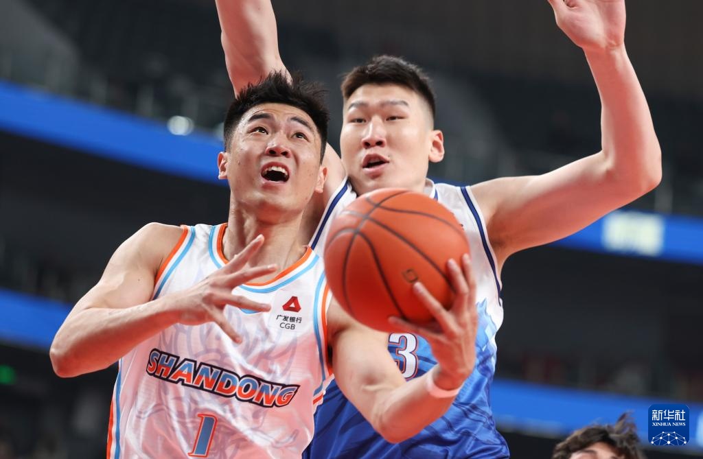 3月7日,新疆伊力特隊球員齊麟(右)持球突破山東高速隊球員陳培東的防守。新華社記者 胡虎虎 攝