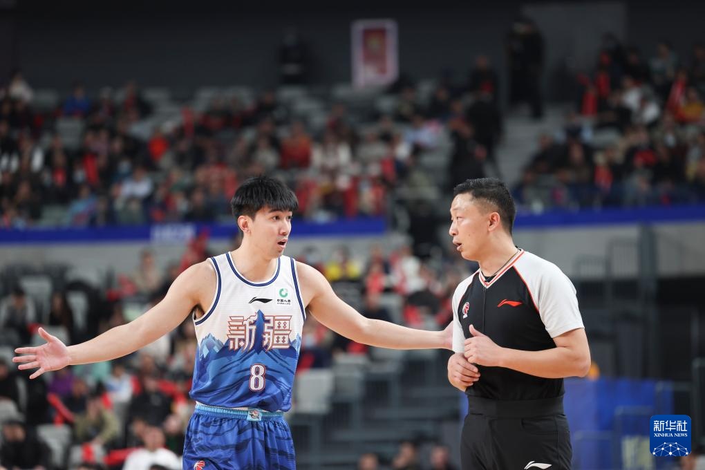 3月7日,新疆伊力特隊球員唐才育(左)和裁判溝通。新華社記者 胡虎虎 攝
