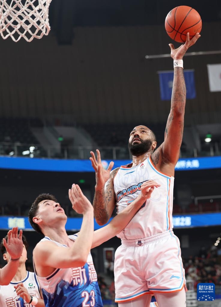 3月7日,山東高速隊球員吉倫沃特(右)在新疆伊力特隊球員阿不都沙拉木的防守下投籃。新華社記者 胡虎虎 攝
