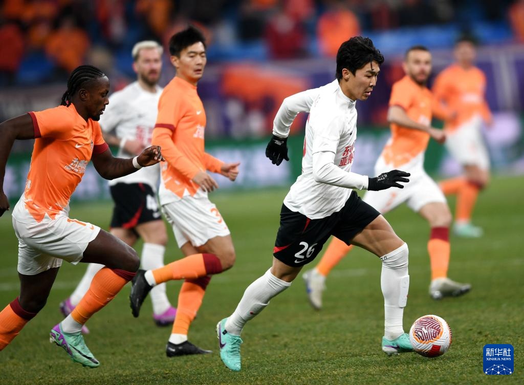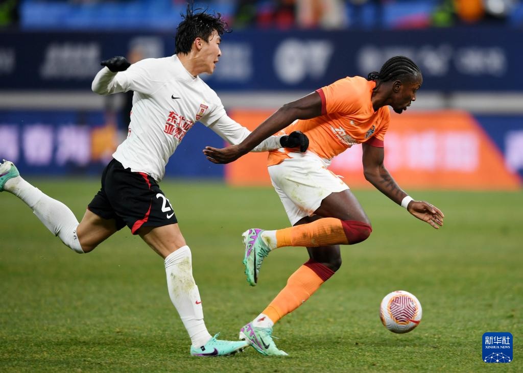 3月8日,長(zhǎng)春亞泰隊(duì)球員嚴(yán)智宇(右)與青島海牛隊(duì)球員胡靖航拼搶。新華社記者 李紫恒 攝