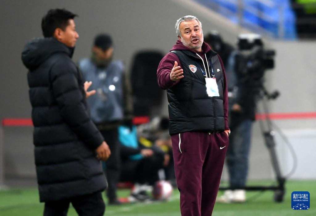 3月8日,青島海牛隊(duì)主教練亞森(右)在場(chǎng)邊指揮。新華社記者 李紫恒 攝