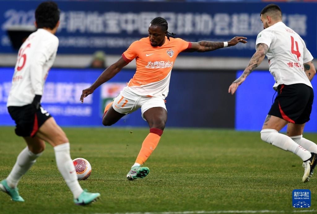 3月8日,青島海牛隊(duì)球員博阿基耶(中)在比賽中射門。新華社記者 李紫恒 攝