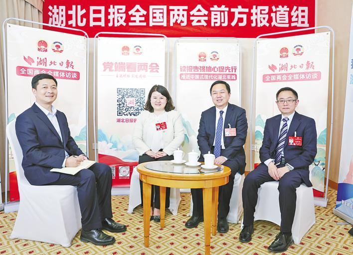劉啟俊代表(右二)、李龍倜代表(左二)、李剛代表(右一)接受本報全媒體訪談。 (湖北日報全媒記者 陳跡 攝)