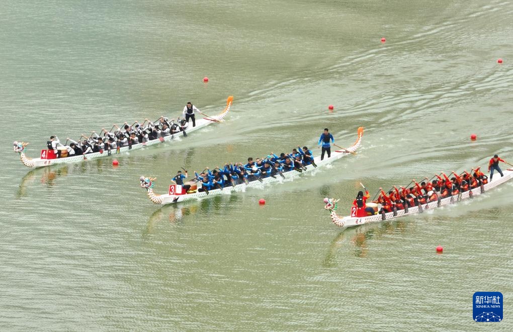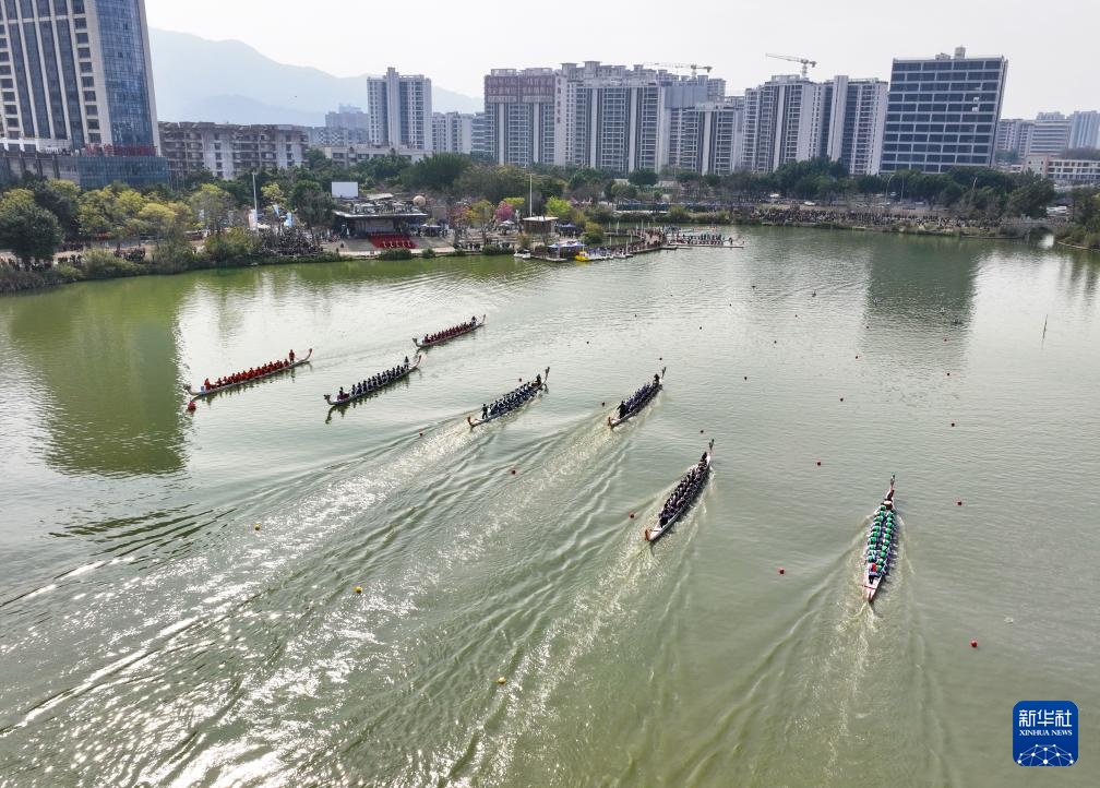 這是3月10日拍攝的晉安湖龍舟競速賽比賽現場(無人機照片)。新華社記者 林善傳 攝
