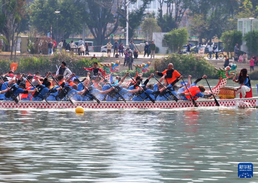 3月10日,參賽隊伍在晉安湖龍舟競速賽比賽中。新華社記者 林善傳 攝