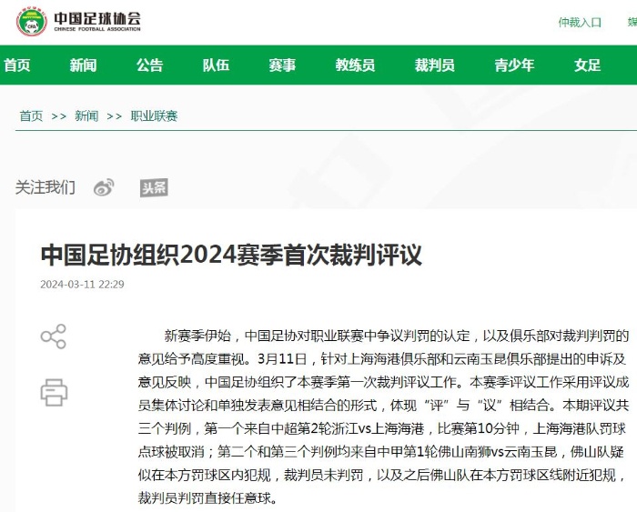 新華社北京3月11日電 中國足協(xié)11日召開2024賽季第一次裁判評議會議,對上海海港隊和云南玉昆隊提出申訴或意見反饋的3個爭議判罰進行評議,并在官網(wǎng)公布評議結果。