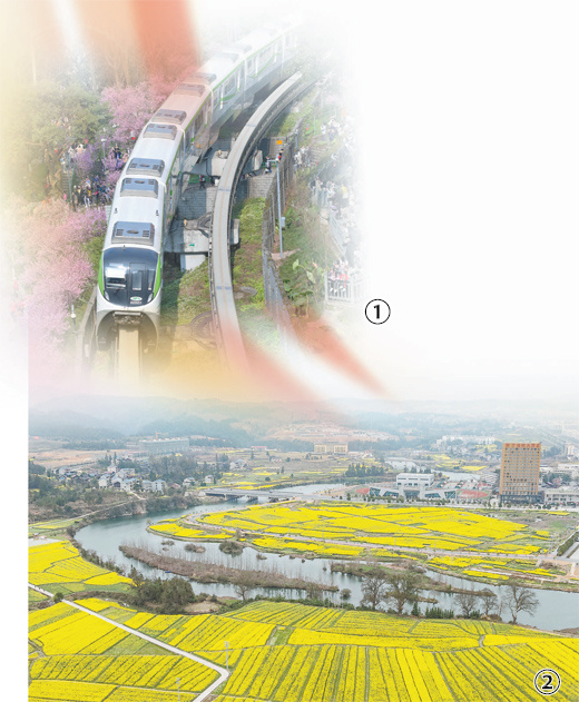 圖①:重慶佛圖關隧道附近春意盎然,軌道交通列車穿越而過。 賀志付攝(人民視覺) 圖②:貴州省黔東南苗族侗族自治州錦屏縣敦寨鎮敦寨村一帶,金黃的油菜花與村莊、河流、樹木等相映成趣。 李必祥攝(人民視覺) |