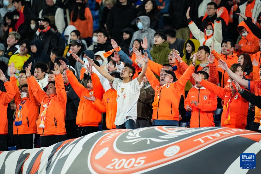 3月13日,山東泰山隊球迷在比賽中為球隊加油。新華社記者 張笑宇 攝