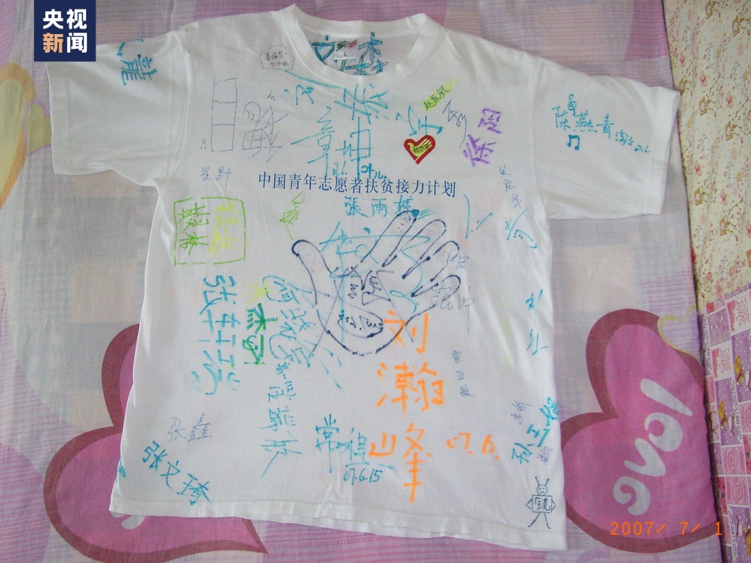 △支教結(jié)束前,學(xué)生們在于湛瑤的T恤上簽名留念。(左下角處有張鑫簽名)