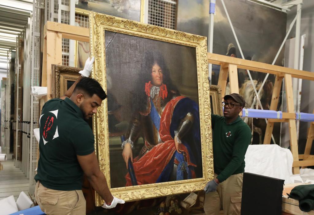 3月11日,在法國(guó)巴黎近郊的凡爾賽宮,工作人員準(zhǔn)備打包油畫《路易十四戎裝像》。新華社記者高靜攝