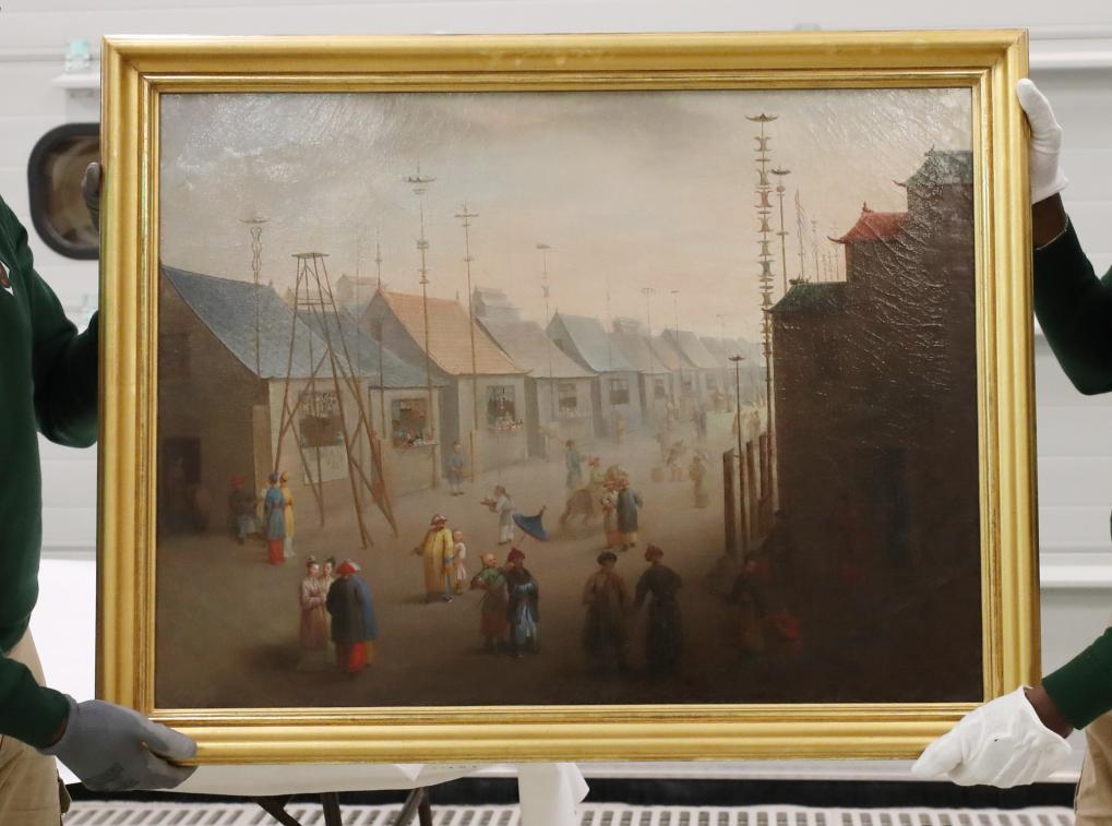 3月11日,在法國(guó)巴黎近郊的凡爾賽宮,工作人員準(zhǔn)備打包油畫《南京的集市》。新華社記者高靜攝