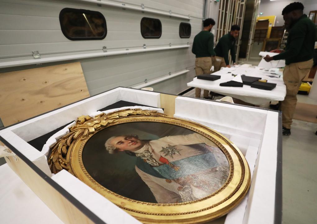 3月11日,在法國(guó)巴黎近郊的凡爾賽宮,工作人員打包油畫《路易十六半身肖像》。新華社記者高靜攝