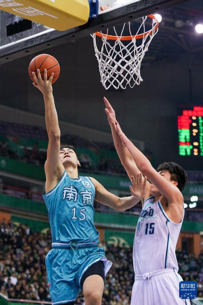 3月14日,南京頭排蘇酒隊球員劉東(左)在青島國信水產隊球員楊瀚森的防守下上籃。新華社記者 李博 攝