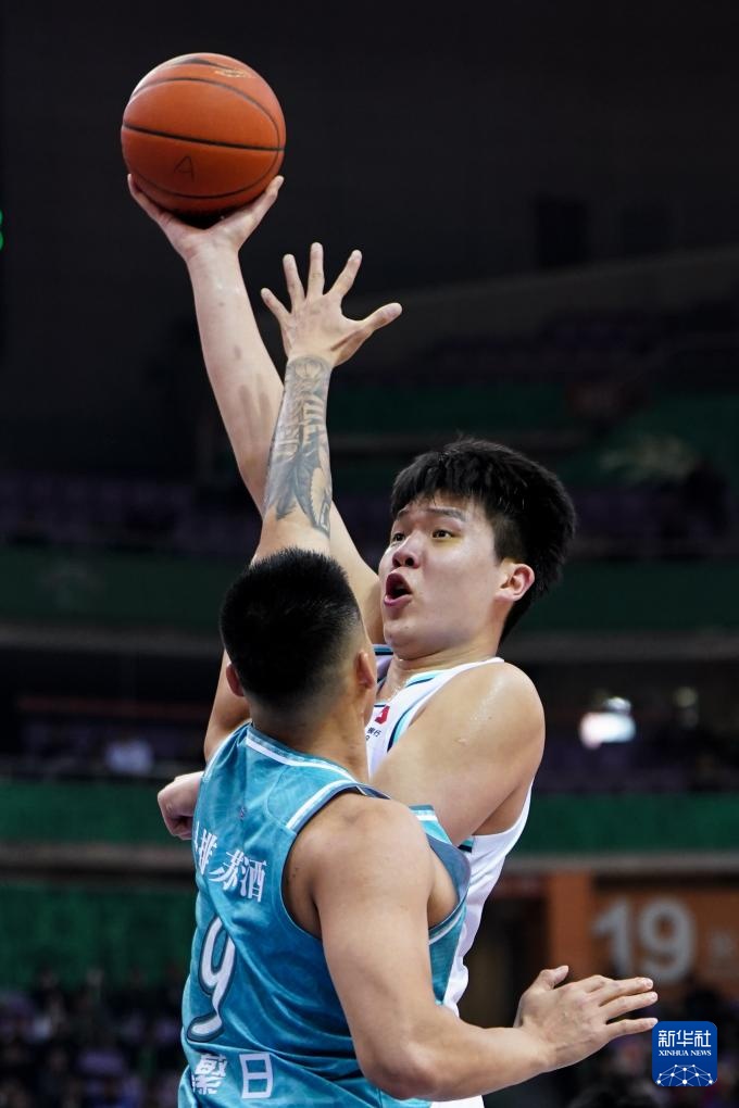 3月14日,青島國信水產隊球員楊瀚森(右)在南京頭排蘇酒隊球員曾繁日的防守下投籃。新華社記者 李博 攝