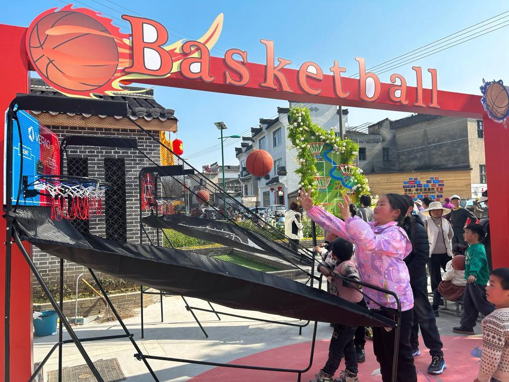 10歲的西溪南鎮居民潘華琳正在體驗投籃。新華社記者 周暢 攝