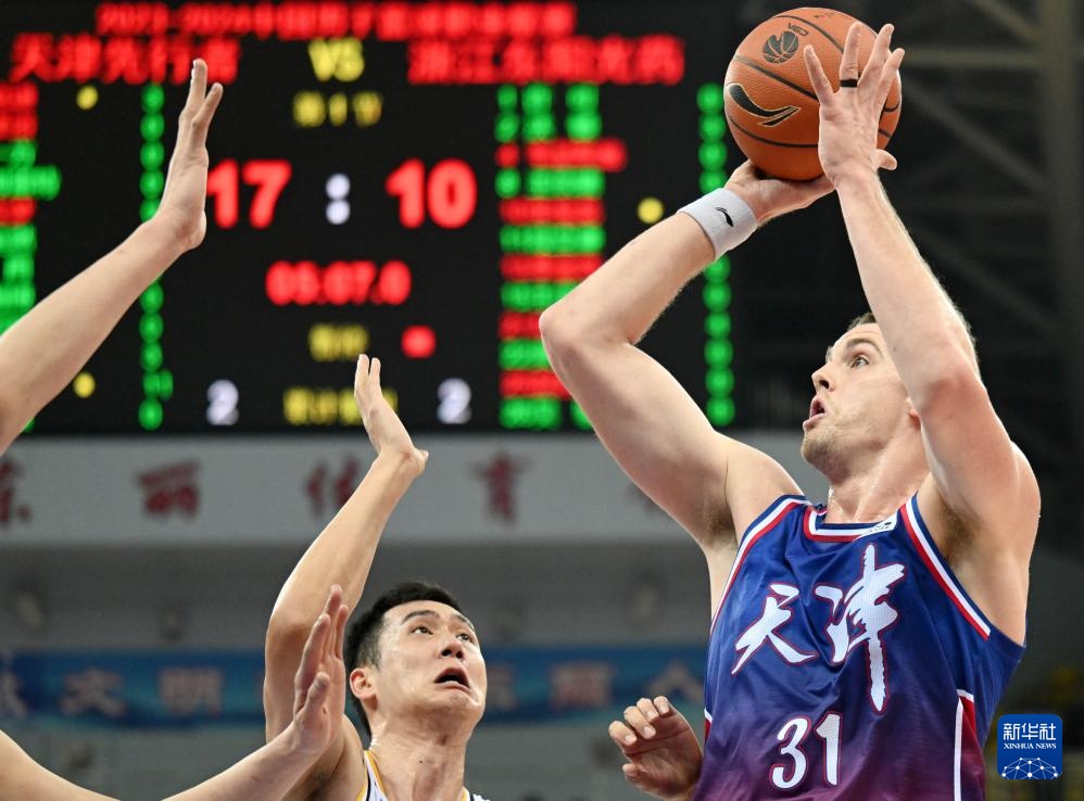 當日,在2023-2024賽季中國男子籃球職業聯賽(CBA)常規賽第43輪比賽中,天津先行者隊主場108比102戰勝浙江東陽光藥隊。
