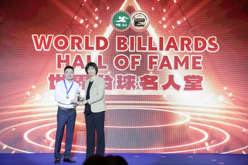 中國臺球協會主席王濤為丁俊暉頒發入堂獎杯。