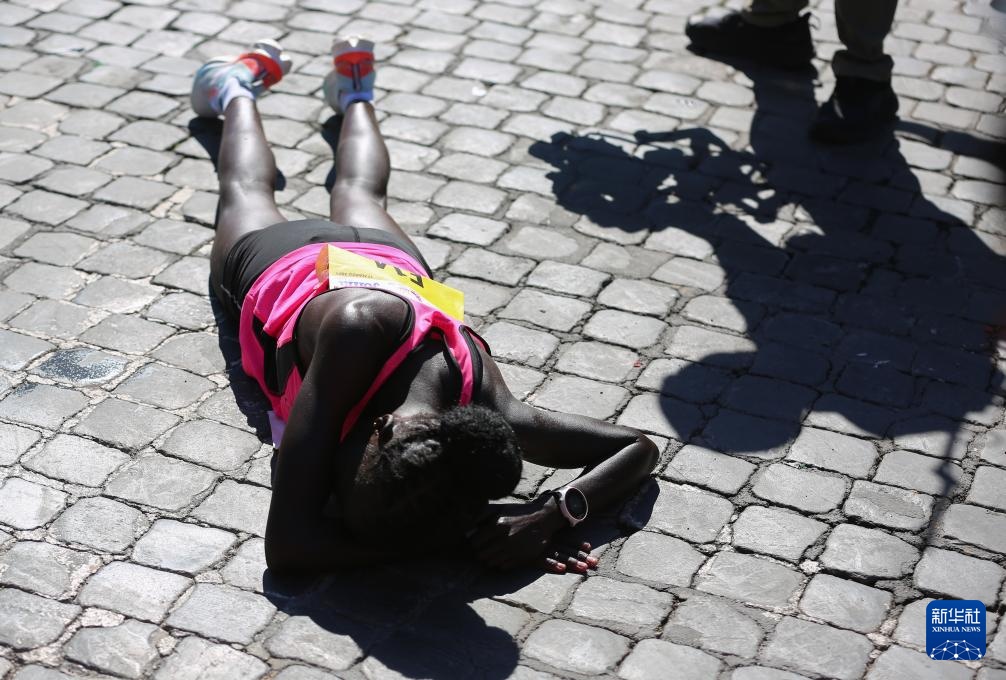 3月17日,肯尼亞選手拉加特在沖線后倒地。她以2小時24分36秒的成績獲得女子組冠軍。新華社記者 李京 攝