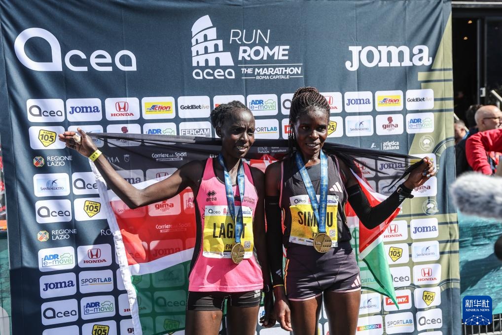 3月17日,肯尼亞選手拉加特(左)和隊友西米尤在賽后慶祝。拉加特以2小時24分36秒的成績獲得女子組冠軍,西米尤以2小時25分10秒的成績獲得女子組亞軍。新華社記者 李京 攝