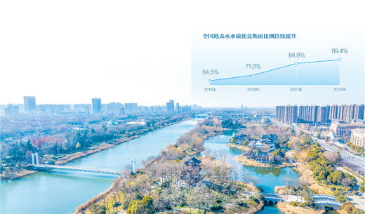 2023年,全國地表水水質優良斷面比例達到89.4%,比2012年提高27.8個百分點