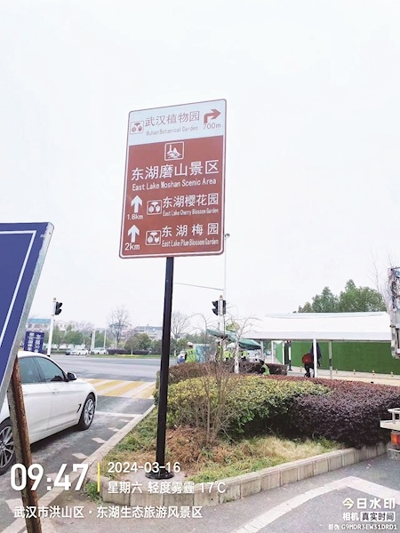 “以往,由于東湖櫻花園周邊缺少道路引導(dǎo)指示牌,造成游客不能準(zhǔn)確地到達(dá)目的地。今年,我們專門做了優(yōu)化升級,在景區(qū)周邊和內(nèi)部重要交通節(jié)點處都放置了交通引導(dǎo)標(biāo)牌。”東湖風(fēng)景區(qū)文旅局相關(guān)負(fù)責(zé)人介紹,他們分別在梅園西門至梅園碼頭、磨山北門至梅園碼頭、魯磨路沿線岔路口、植物園路岔路口、攬翠路沿線岔路口等周邊路邊,新增或更換交通指示牌39個,無論游客從哪個方向來,無論是坐公交、出租車,還是自駕、乘游船,都能第一時間看見交通引導(dǎo)標(biāo)志牌,找到方向。